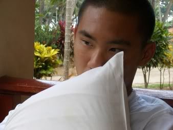 Went back to resort after lunch... And thats the last time we see that couple... My darling took a little nappy again... As for me, I just took a can of soft drink and some tibits and went to sit at the balcony... It wasnt a very hot weather but kinda cooling... So nice to be sitting down there and having a drink... Listening to the sea and the surrounding peace... Feel so relax... After a while, he realised that I'm missing and called for me... End up being dragged by me out to the balcony too... See his sleepy look... So cute and sweet... Still hugging that pillow... Really is my little sweetheart...