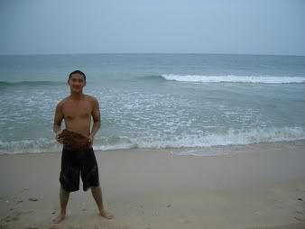 After some discussion, we decided to go for a swim in the sea... Both of our parents were worried about us for playing with the sea sports and the sea... The waves were really kinda big consider to those in Sentosa lar... But overall its still ok for us... The water there is very clear lor... And we can walk out into the sea for quite a long distance and still only up to our knee level only... How fun... After that we sat down on the coast and play with the water... Feel very confortable with the waves hitting on us... My little darling was luffing so much... Felt so happy to see him so happy... The sand there were very fine... We even used it for some sand scrub on ourselves... After that our skin feel so smooth... How nice... Then I caught some Hermit Crabs... Lol... They look so cute... I found a container and put them all in... Caught about 6 in total... Hehehe...